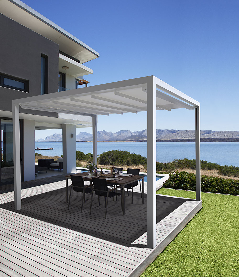 Bei der PERGOLA SUNRAIN Q wurden sämtliche Anforderungen an modernes, zeitloses Design und effektiven Schutz vor Sonne, Wind und Regen konstruktiv umgesetzt. Schöner und effektiver kann Wetterschutz nicht sein. Das kubische Rahmengestell passt vom Design an jedes moderne Gebäude. Die Montage kann freistehend fixiert auf Fundamente oder einseitig an der Wand erfolgen. Mehrere Anlagen können problemlos „in Reihe“ aufgestellt werden.