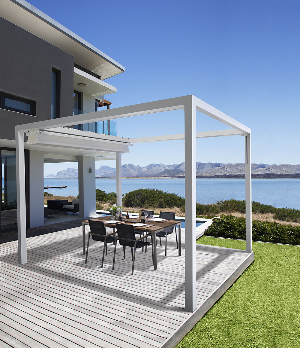 Bei der PERGOLA SUNRAIN Q wurden sämtliche Anforderungen an modernes, zeitloses Design und effektiven Schutz vor Sonne, Wind und Regen konstruktiv umgesetzt. Schöner und effektiver kann Wetterschutz nicht sein. Das kubische Rahmengestell passt vom Design an jedes moderne Gebäude. Die Montage kann freistehend fixiert auf Fundamente oder einseitig an der Wand erfolgen. Mehrere Anlagen können problemlos „in Reihe“ aufgestellt werden.